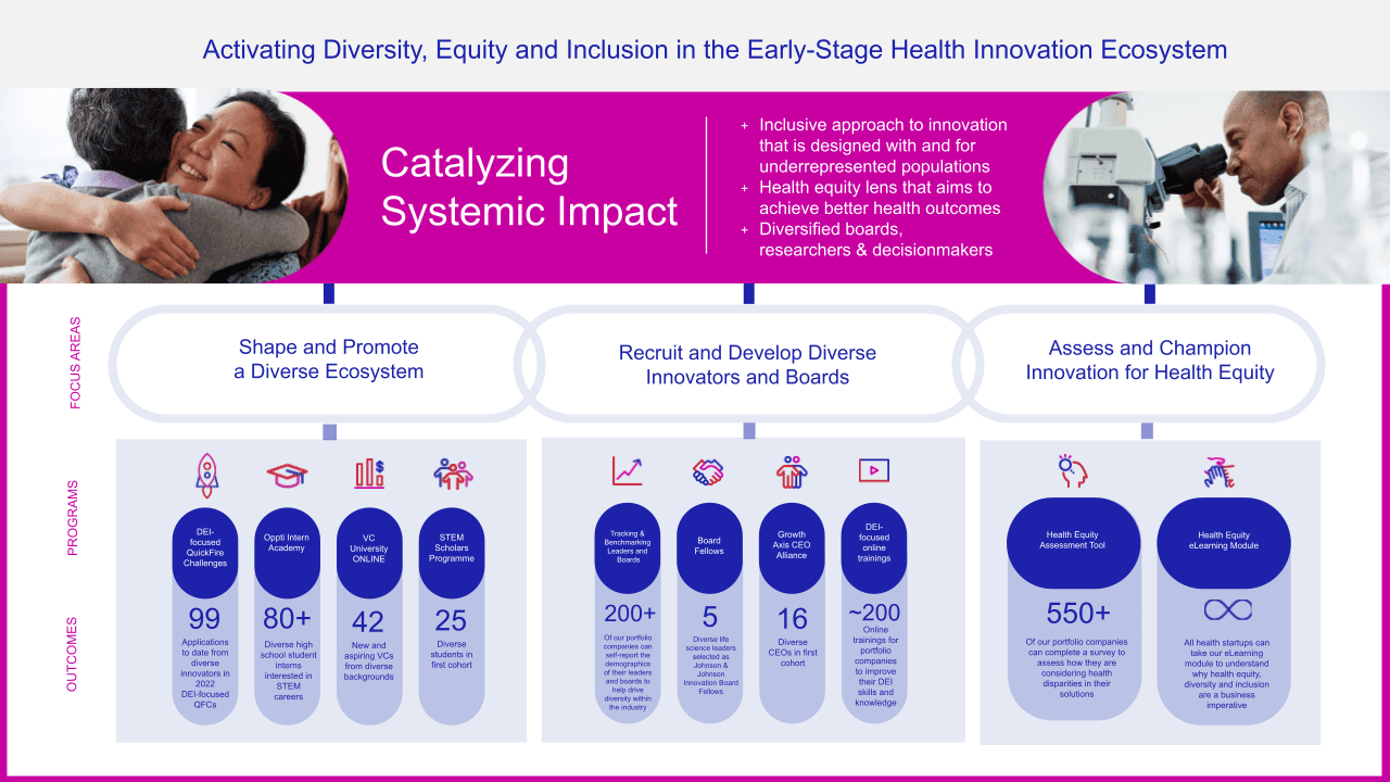 Johnson & Johnson Innovation (JJI) serves as the entry point to Johnson & Johnson’s global expertise for early-stage life science innovators and startups. With a unique opportunity to shape the next generation of health innovation, JJI recognized the need to help embed diversity, equity, and inclusion (DEI) at the earliest stages of the companies they invest in.